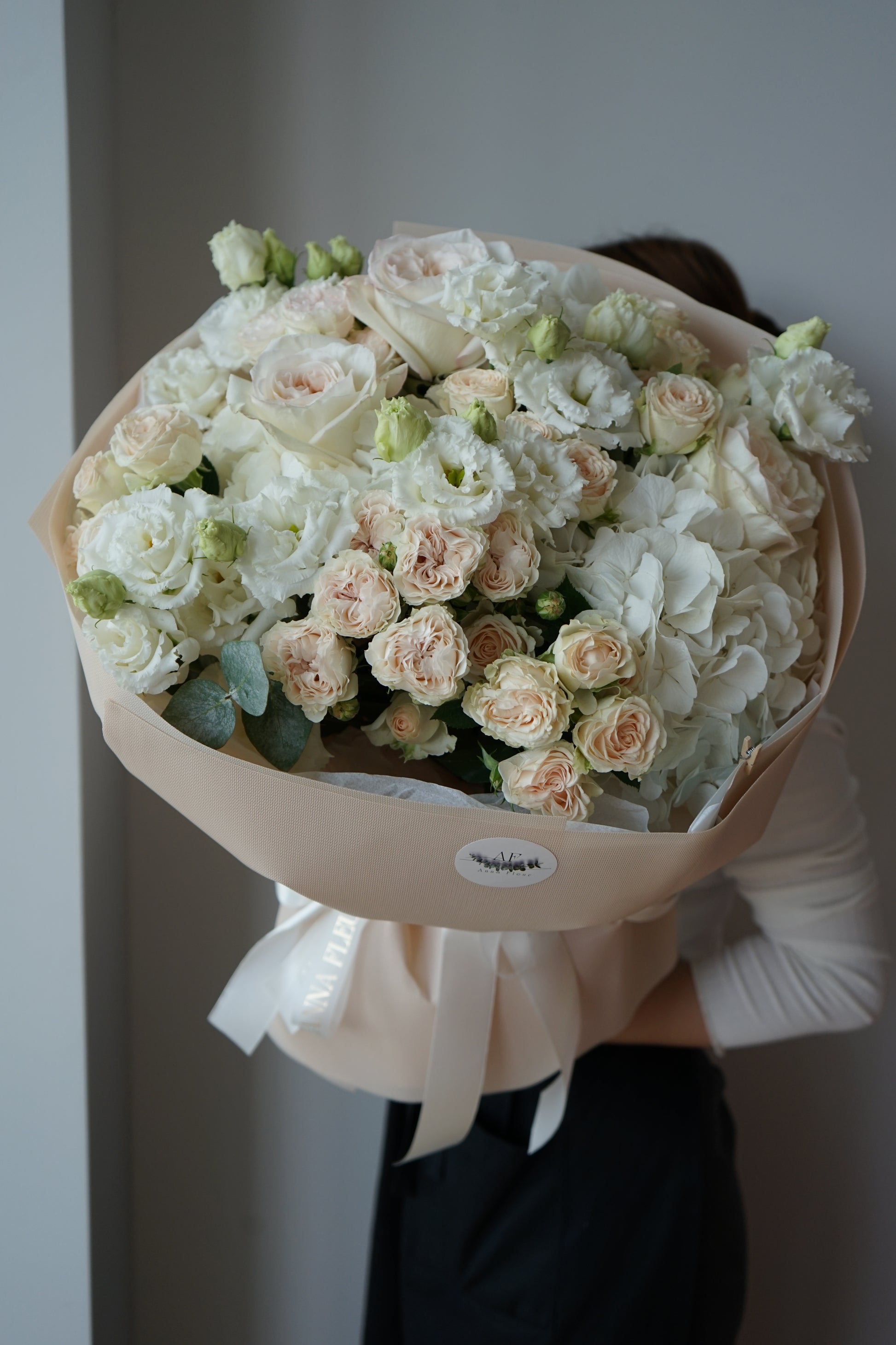 Bukiet "Soft Embrace" - to delikatny bukiet w odcieniach beżu i bieli, emanujący ciepłem i subtelną elegancją. Jak łagodne dotknięcie – uspokaja, inspiruje i wprowadza atmosferę przytulności.