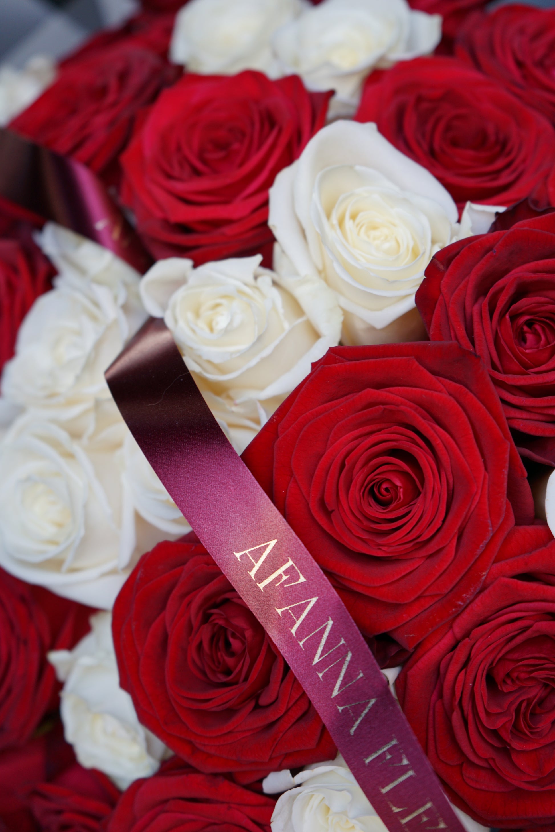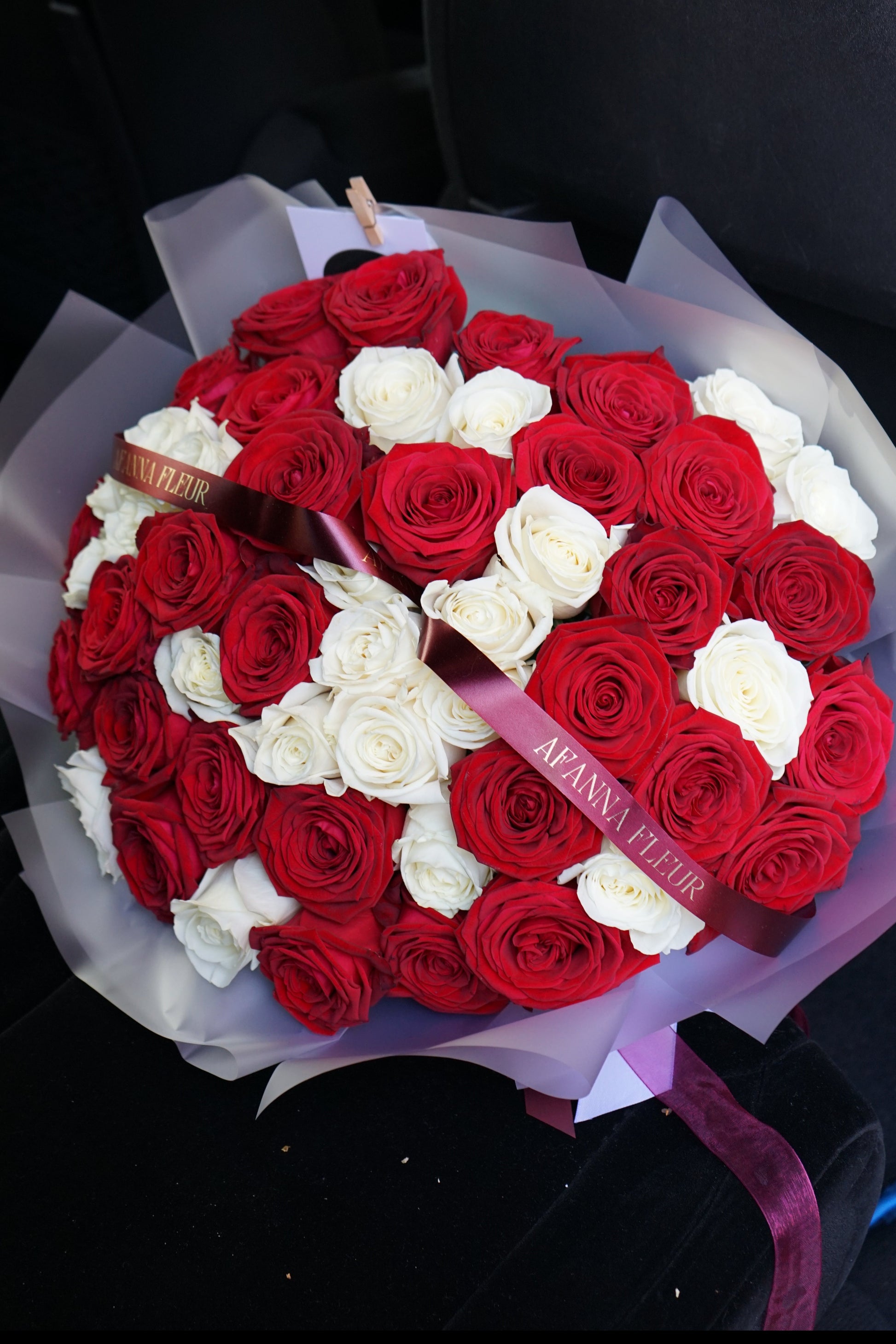 Bukiet mieszanych białych i czerwonych róż. Pasuje sie na kazda okazje. Na zdjęciu bukiet z 51 róż.