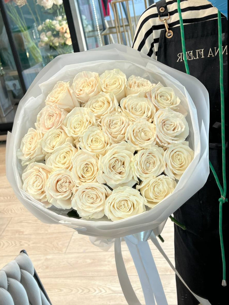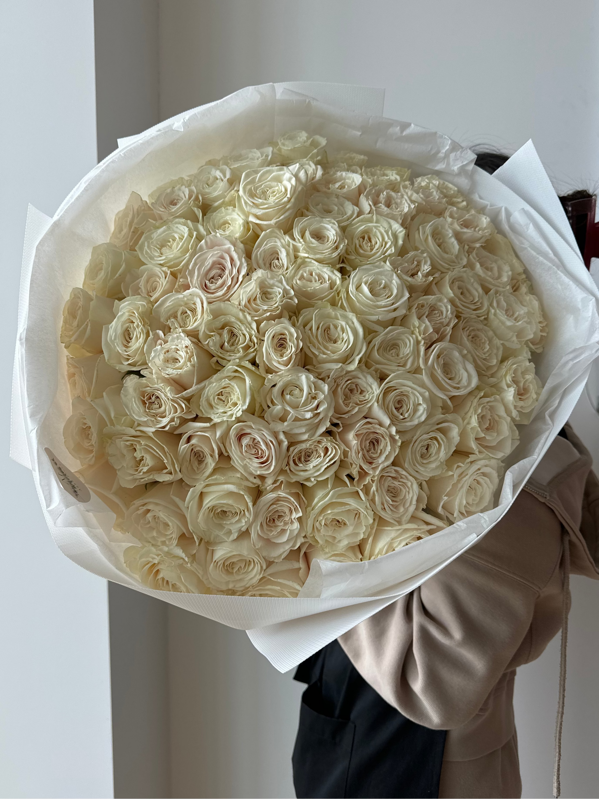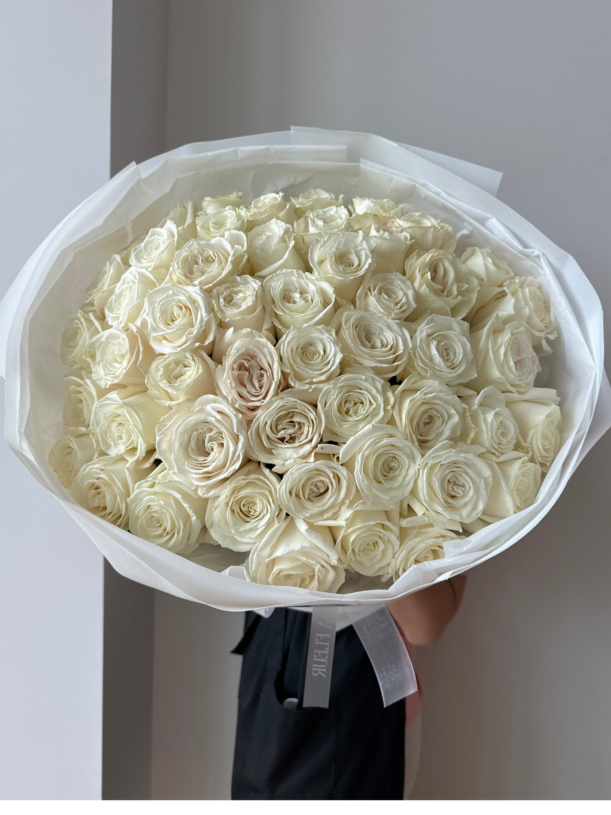 Моно букет из белых роз, длиной 60 см на любой случай. На фото букет из 25, 55 и 101 белой розы.Сорт роз может отличаться от примера на фотографии. Страна происхождения : Эквадор/ Нидерланды.